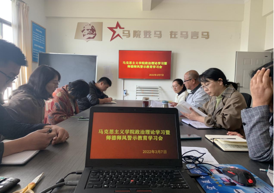 2022年3月7日上午,马克思主义学院在学院会议室召开教职工政治理论学习暨师德师风警示教育学习会。会议由学院党支部书记郑立功同志主持,学院全体教师参加本次会议。